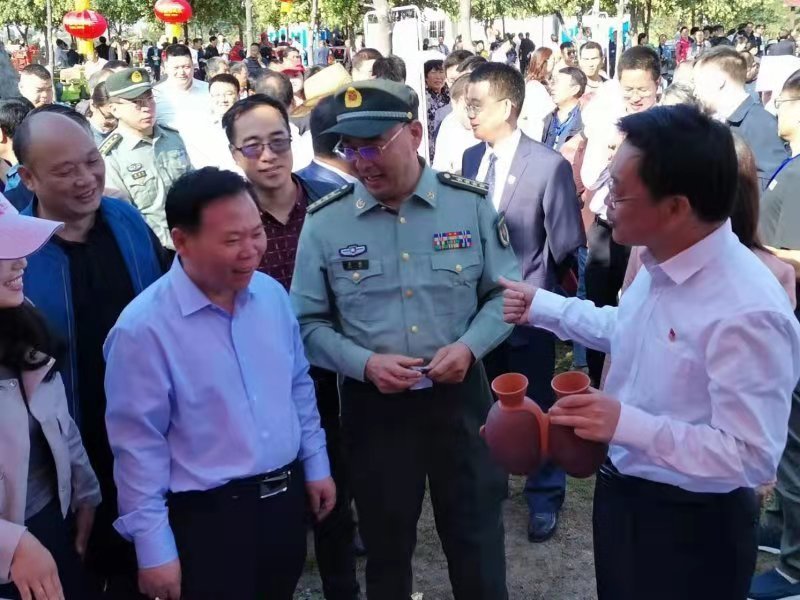 三門峽市市委書記劉南昌,市委常委三門峽市軍分區政委孟斌,縣委書記楊躍民參觀仰韶彩陶坊。